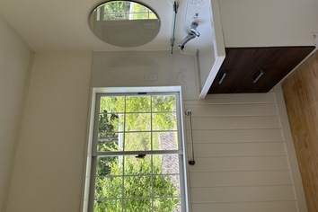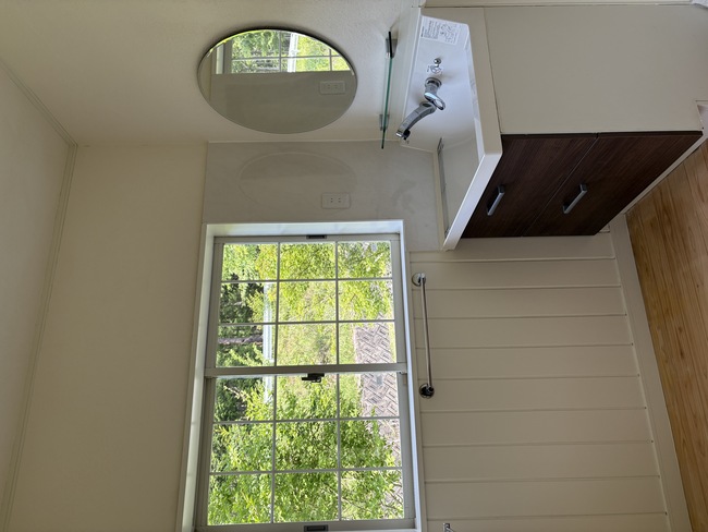 腰壁を塗装。既存の鏡は撤去して、かわいらしい丸鏡を取り付けました。